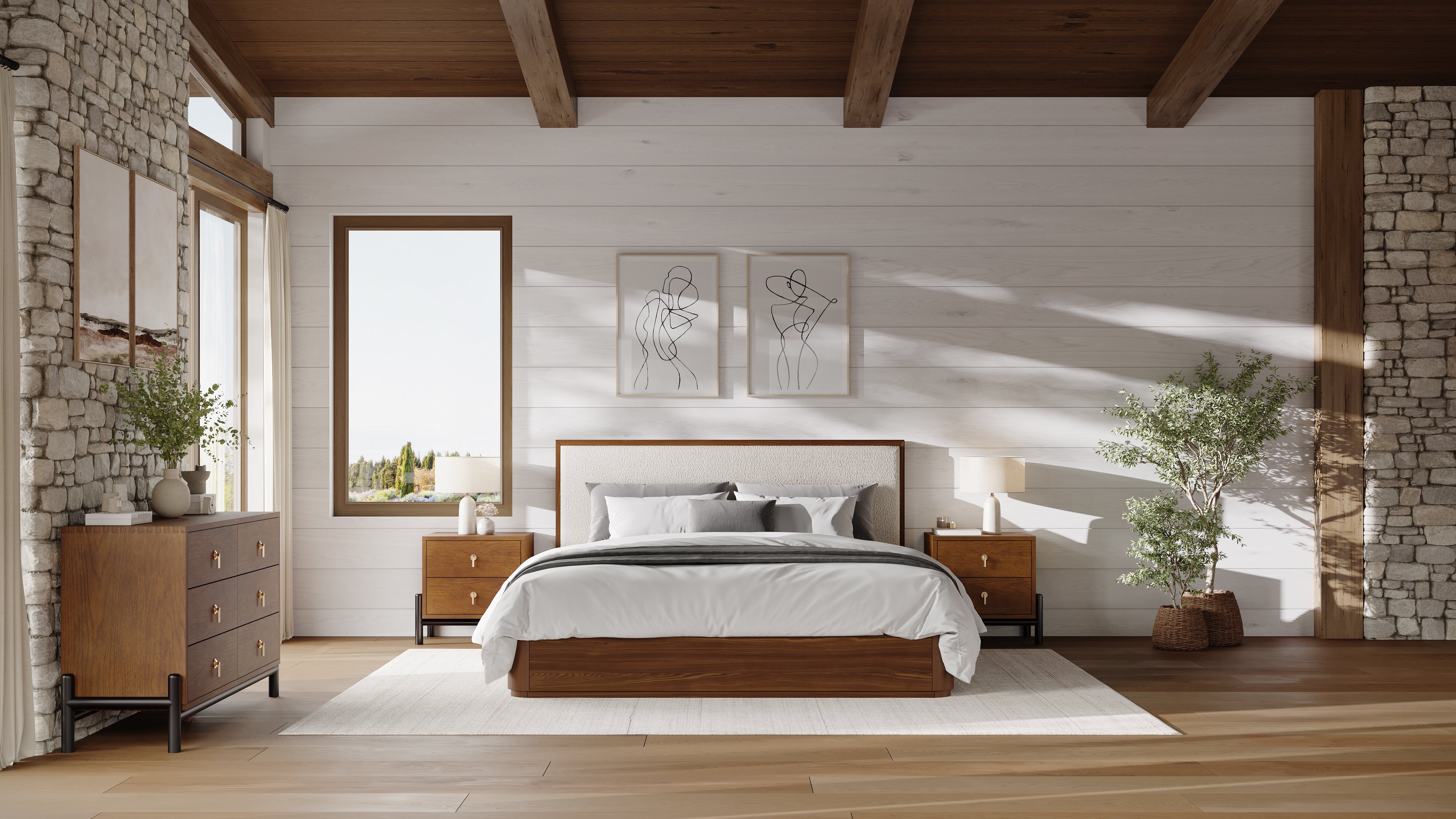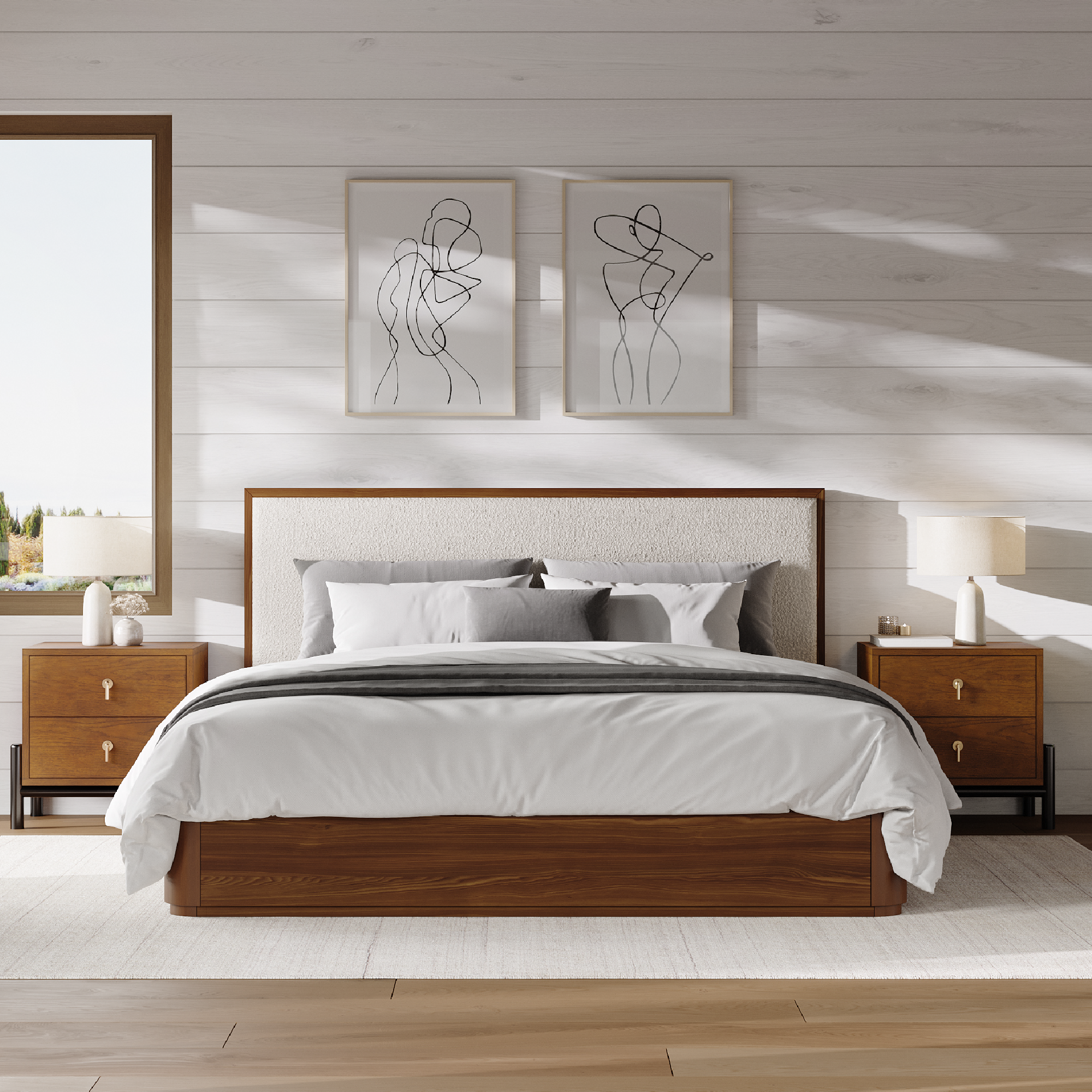 Upholstered in soft fabric, the elegant Teo bed features solid wood with plush boucle upholstery.