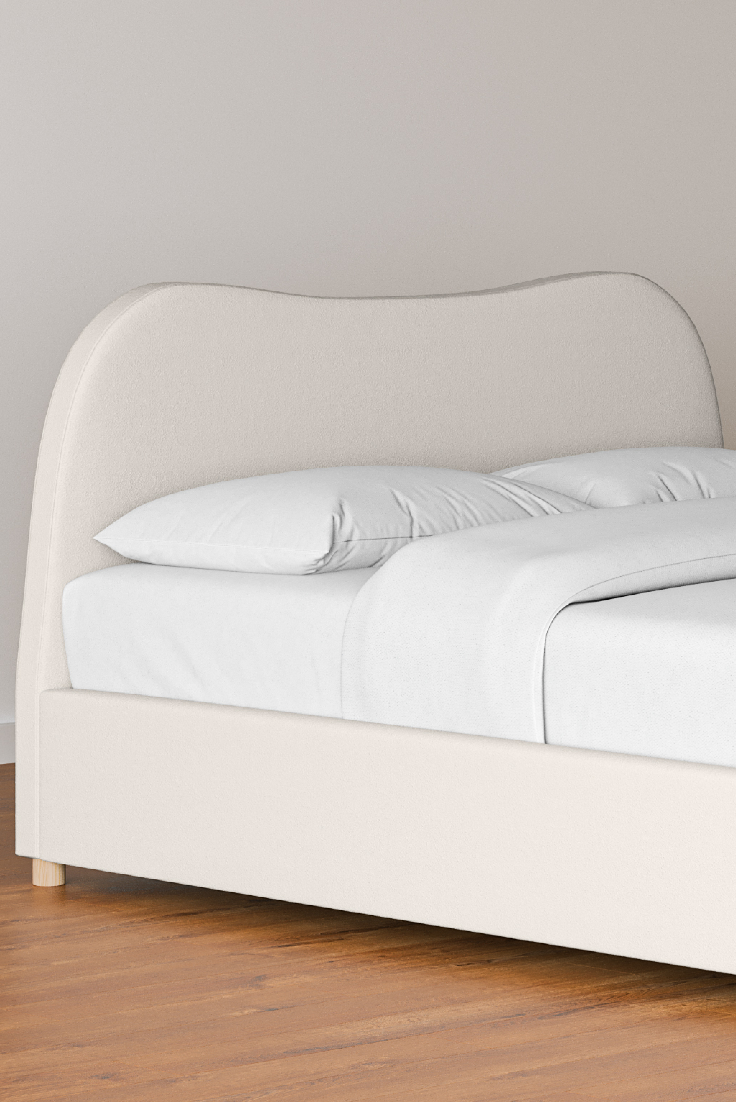 Discover the Haus Modern Camille Boucle Curved Bed, a beacon of romantic elegance for your bedroom. This platform bed features a beautifully curved, cream fabric upholstered headboard, offering a blend of style and comfort. Its modern wooden frame, supported by sturdy wooden slats, eliminates the need for a box spring, ensuring a seamless and supportive sleep experience. Perfect for creating a cozy and sophisticated atmosphere, this bed is an ideal choice for those seeking a touch of luxury in their personal sanctuary.