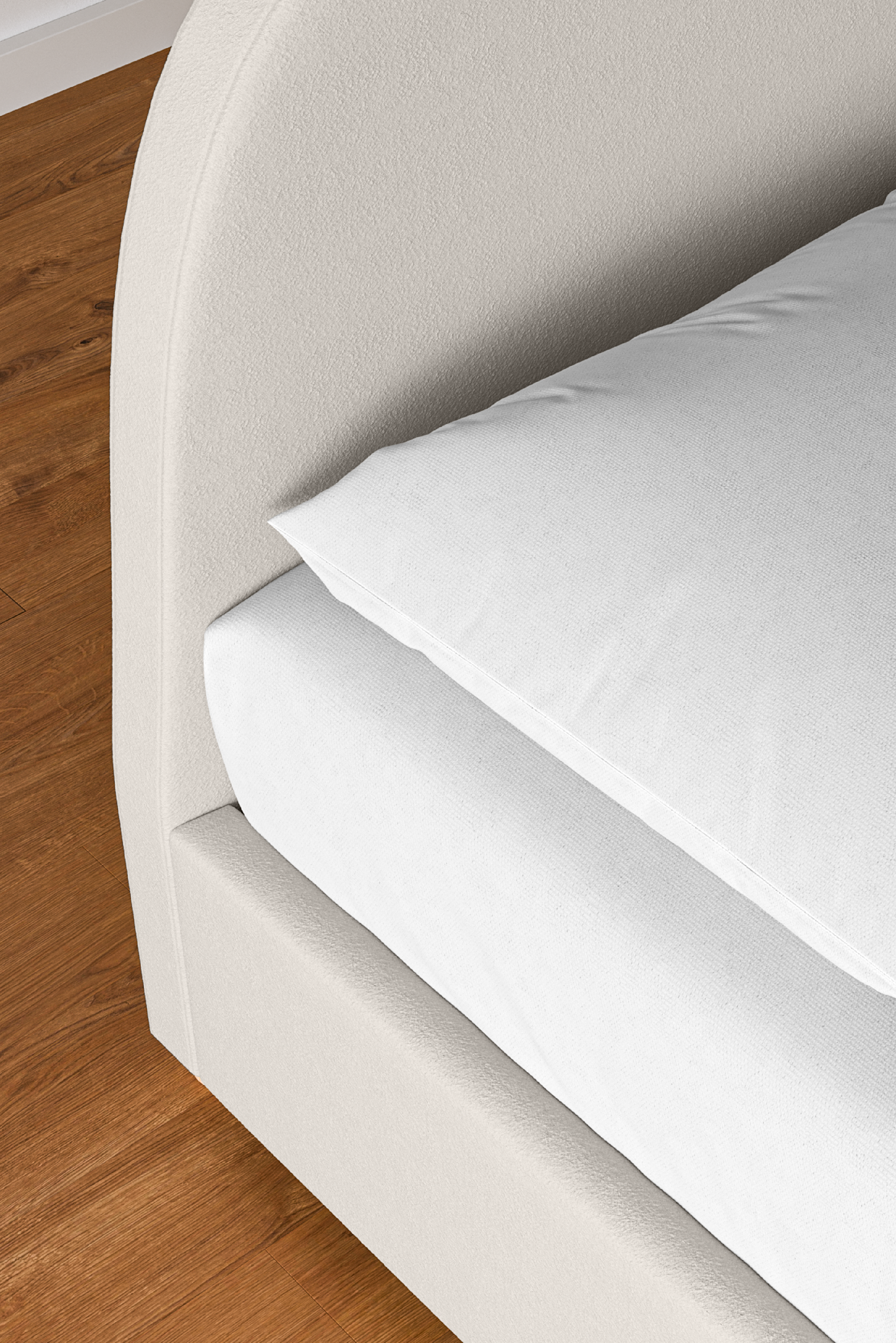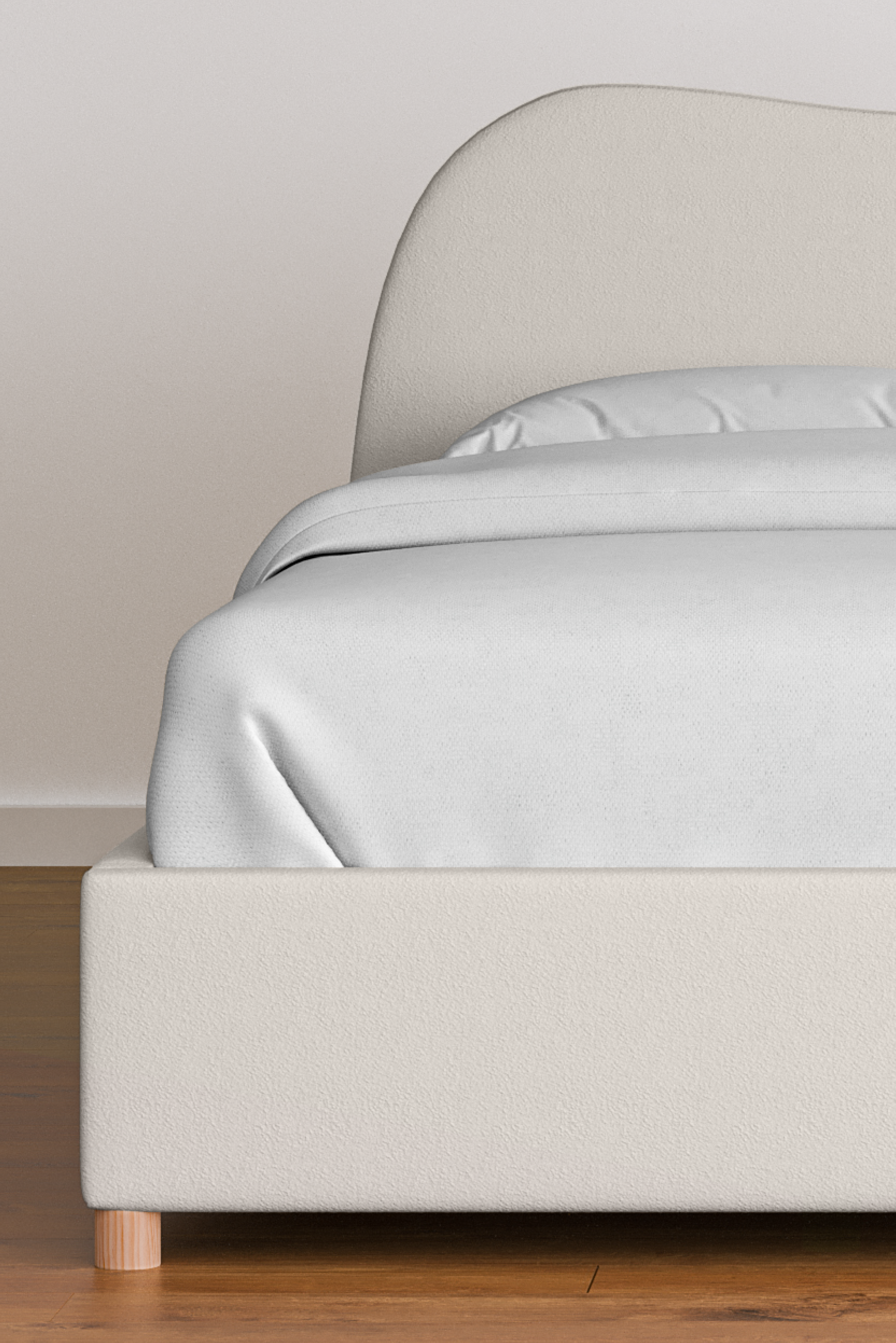 - Upholstered headboard, footboard, side rails in boucle fabric