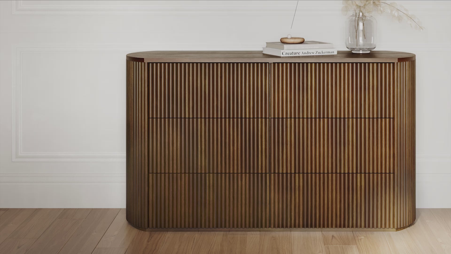 The Harrison Dresser combines style and functionality with its sleek 6-drawer design, crafted from solid wood for durability. Featuring a rich walnut finish, fluted and slatted textures, and chic gold hardware accents, this dresser offers ample storage and a sophisticated, modern look. Its organic design elements and timeless appeal make it a standout piece that elevates any bedroom décor.