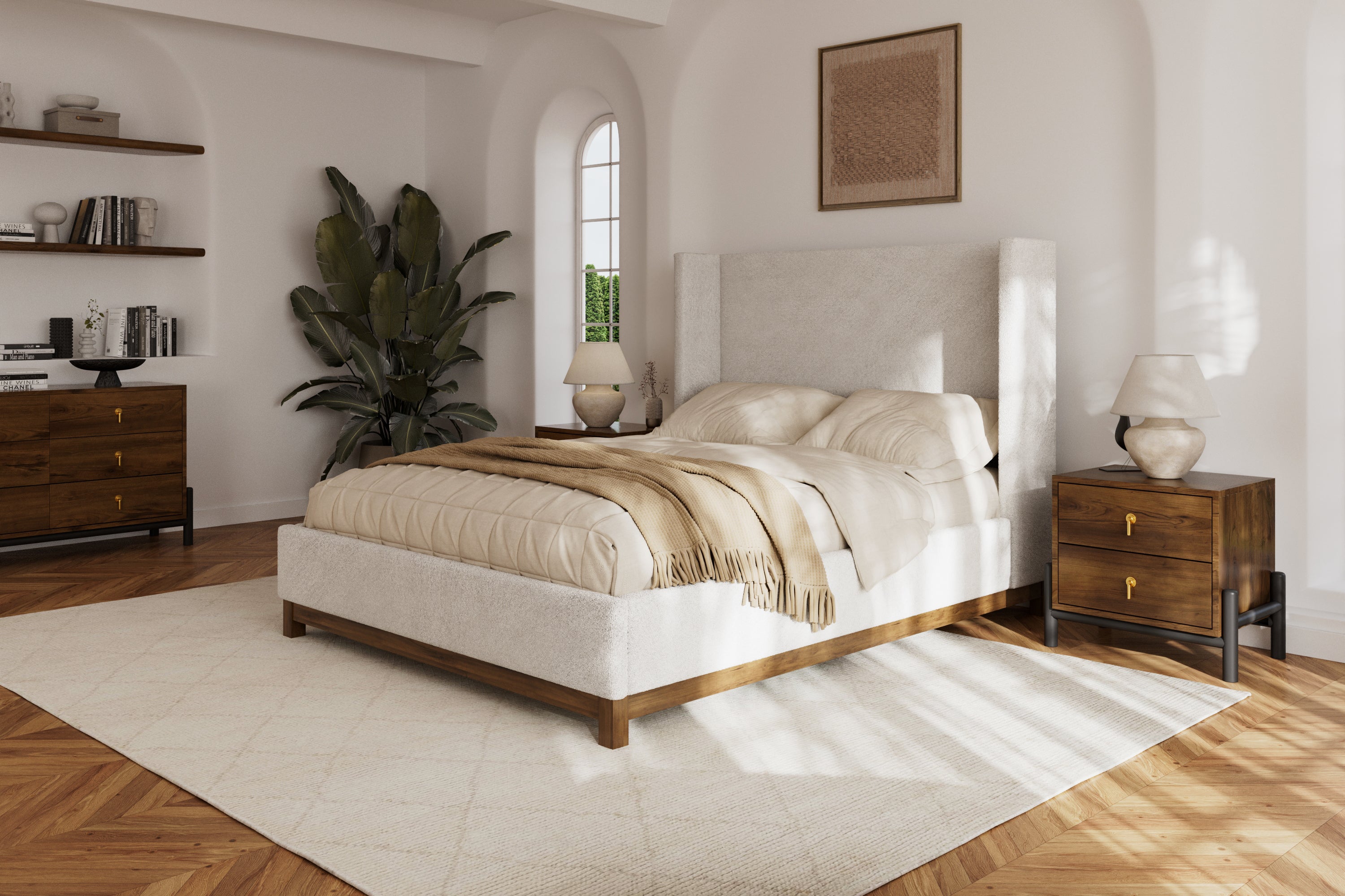 The Jolie Wing Bed is a study in contrasts—soft yet structured, bold yet timeless. We reimagined the classic wingback design with refined lines and a solid wood base, adding warmth and depth to its silhouette. The tall headboard makes a statement, while the oat-colored fabric enhances its versatility, seamlessly complementing both contemporary and traditional interiors. Framed on all four sides by a walnut-stained wood base, Jolie is thoughtfully finished from every angle. Striking the perfect balance between structure and softness, it embodies understated luxury and effortless sophistication.
