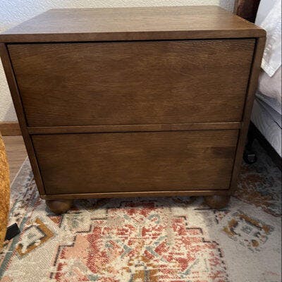 Elevate your bedroom with the Jude Nightstand by Haus Modern, a piece that effortlessly blends style and function. Featuring clean lines and a minimalist design, this nightstand stands out with its bold, sculptural ball-shaped legs, adding a touch of elegance to any space. The rich walnut finish highlights the natural wood grain, bringing warmth and sophistication. Designed for convenience, it includes two spacious push-to-open drawers, offering smooth, handle-free access while maintaining a sleek, streamlined look. Best of all, assembly is quick and easy—just attach the legs, and your nightstand is ready to use.