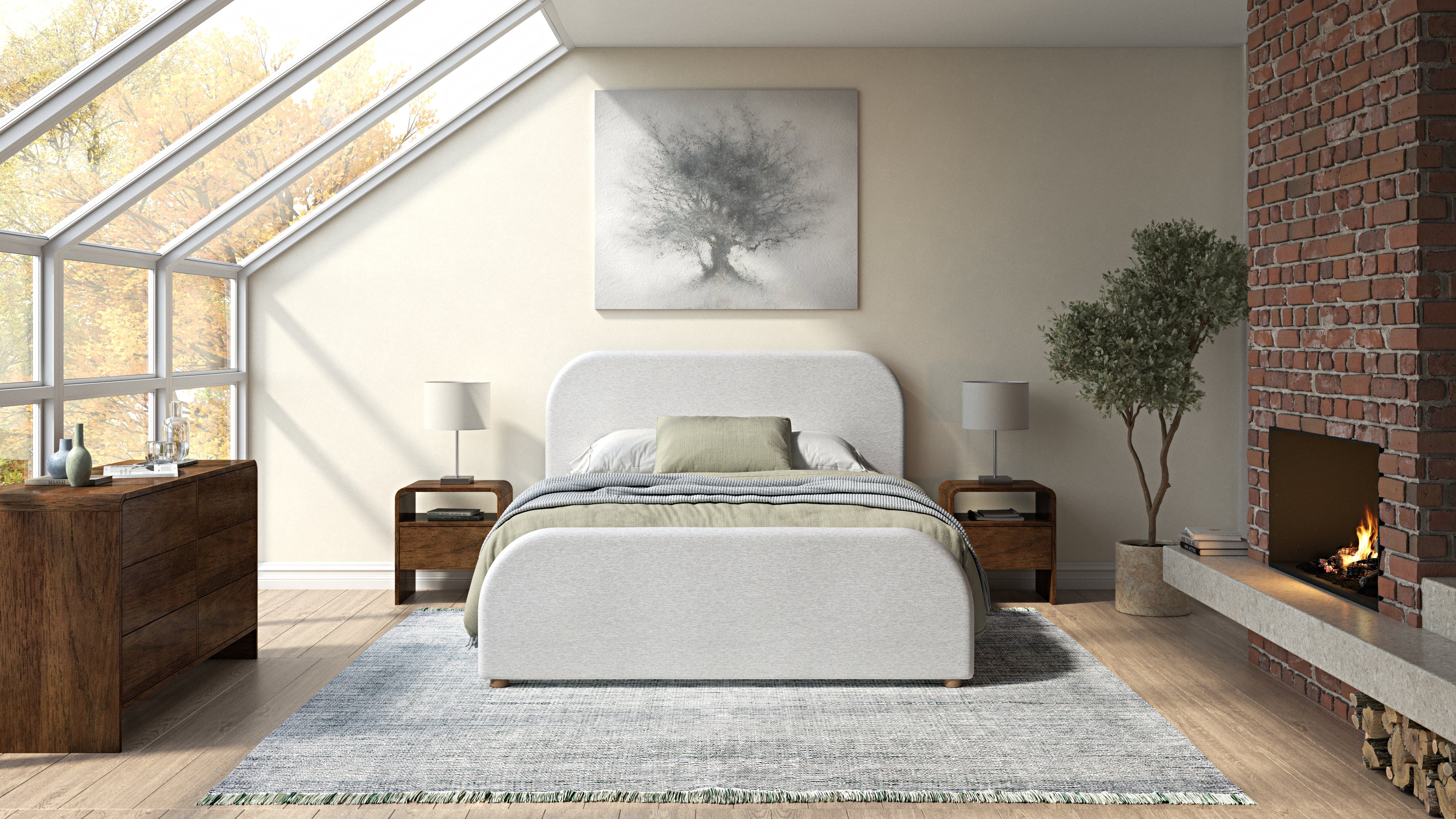 This bed blends soft curves with a heathered ivory fabric, creating a sophisticated centerpiece for the bedroom. Its plush cushioning and high-density foam provide comfort, while the solid wood feet and metal center support ensure lasting durability. To complete the look, pair it with the coordinating solid wood nightstand and dresser, achieving a cohesive, curated aesthetic. The clean design works effortlessly in both modern and boho-inspired interiors, bringing a refined yet understated elegance to the space.