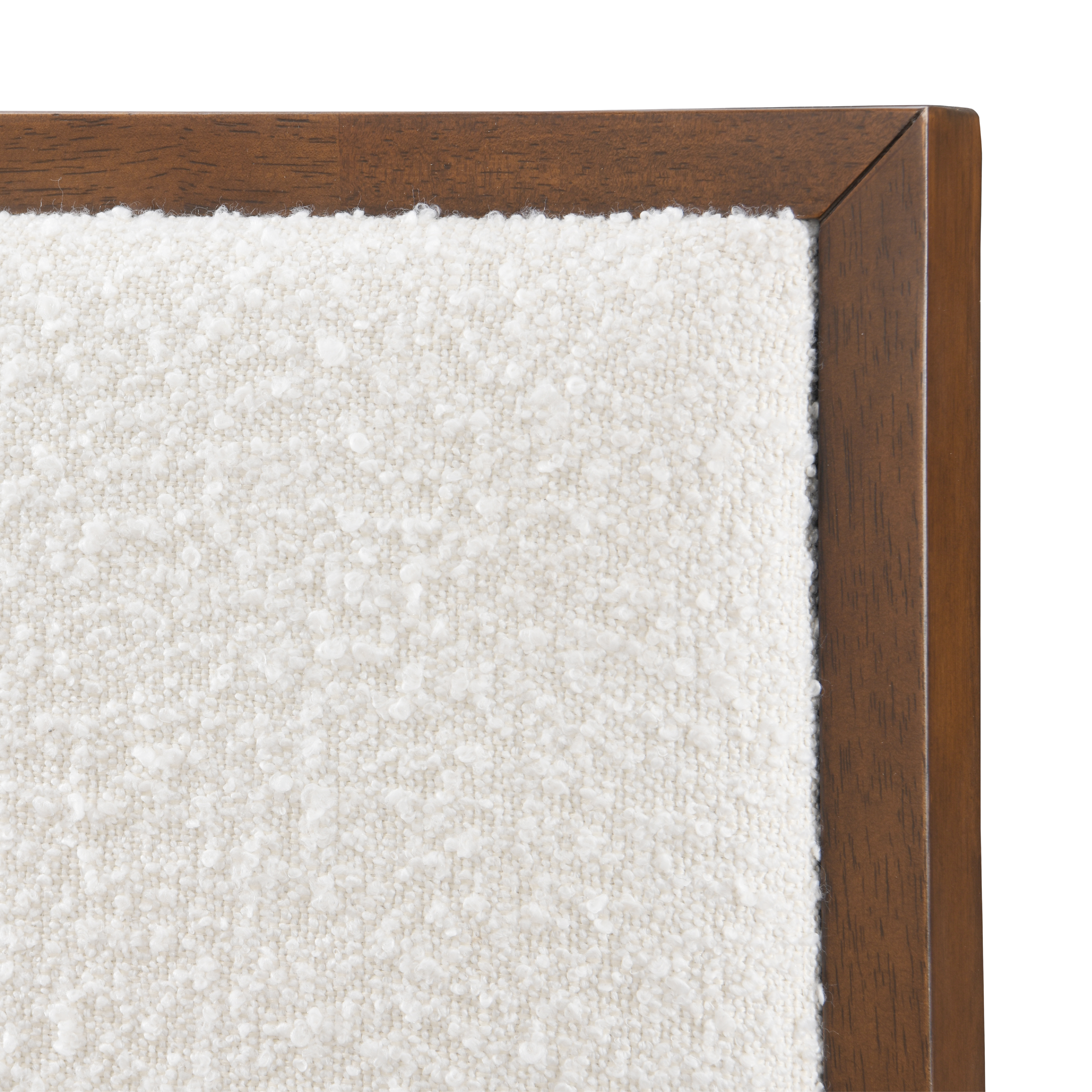 Elegant Walnut Finish: The warm walnut wood beautifully contrasts with the off-white boucle headboard for an inviting look.